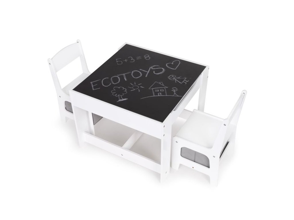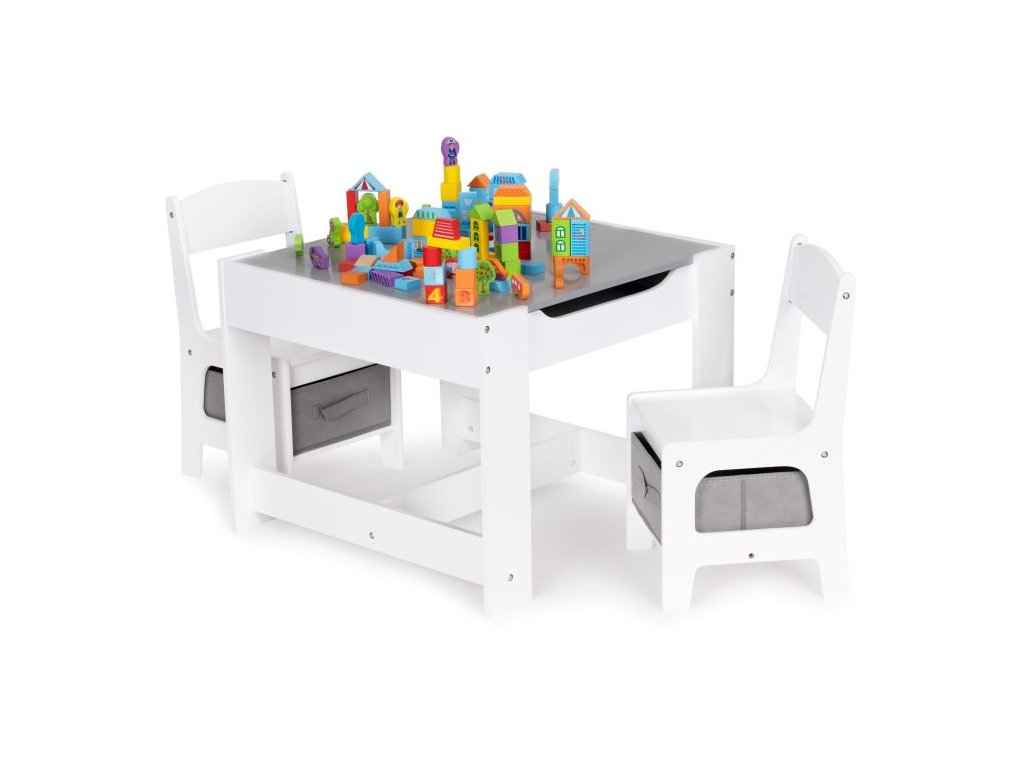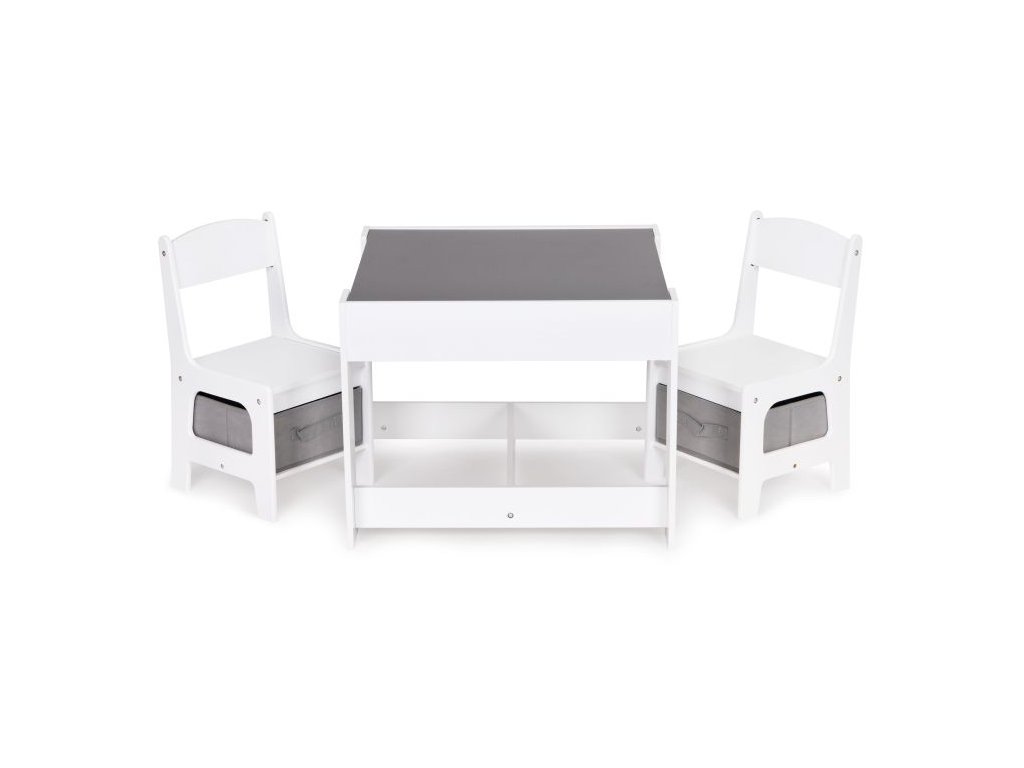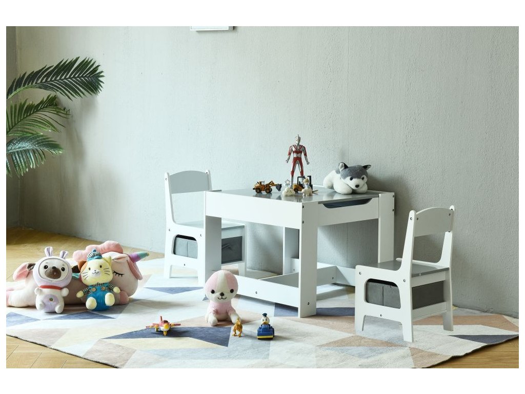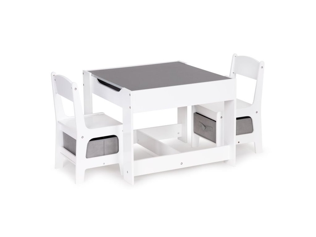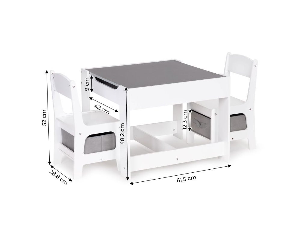 Skvelý set pre všetky malé deti, vďaka svojej jednoduchej forme ideálne zapadne do výzdoby detských izieb, detských izieb alebo čakární. Súprava je vyrobená z MDF, vďaka čomu je odolná voči poškodeniu/poškriabaniu. Doplnkom súpravy sú dve stabilné a pohodlné stoličky, ktoré majú funkčné koše pod sedadlom, ideálne na uloženie hračiek.