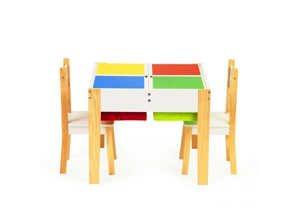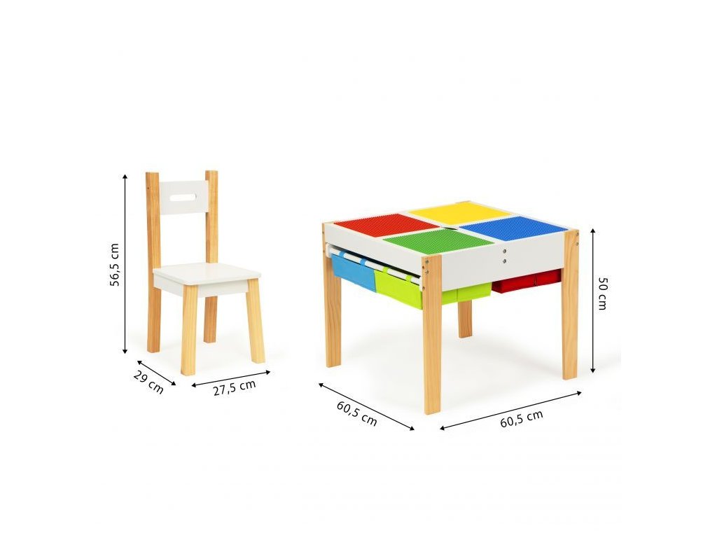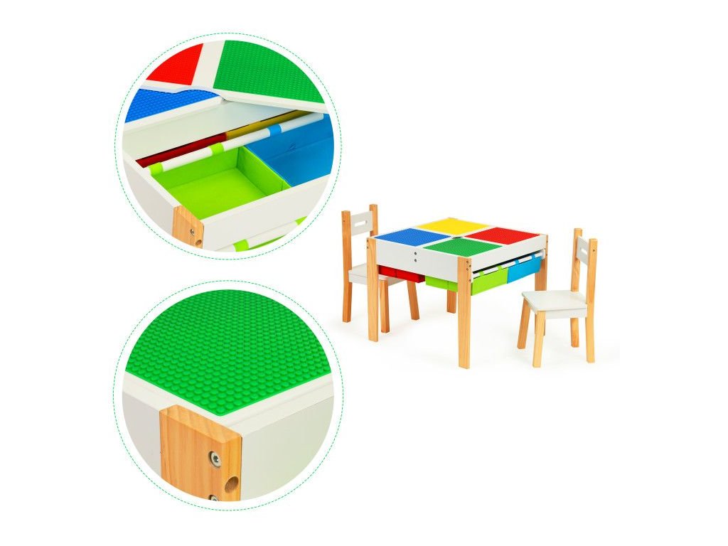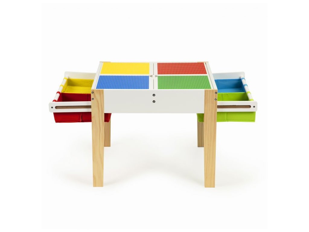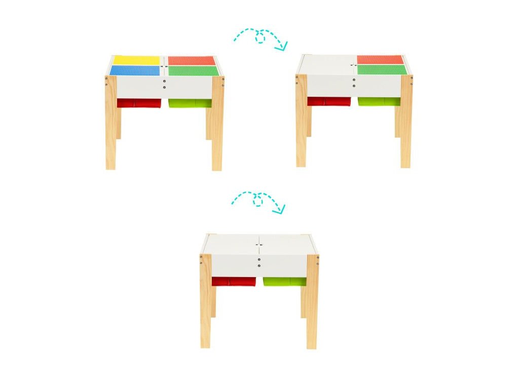 Doska stola sa skladá z 2 odnímateľných prvkov. Na jednej strane sú farebné dosky na skladanie kociek, druhá strana je plochá, umožňuje kreslenie, maľovanie a iné kreatívne hry