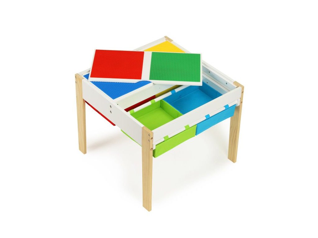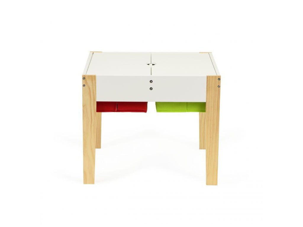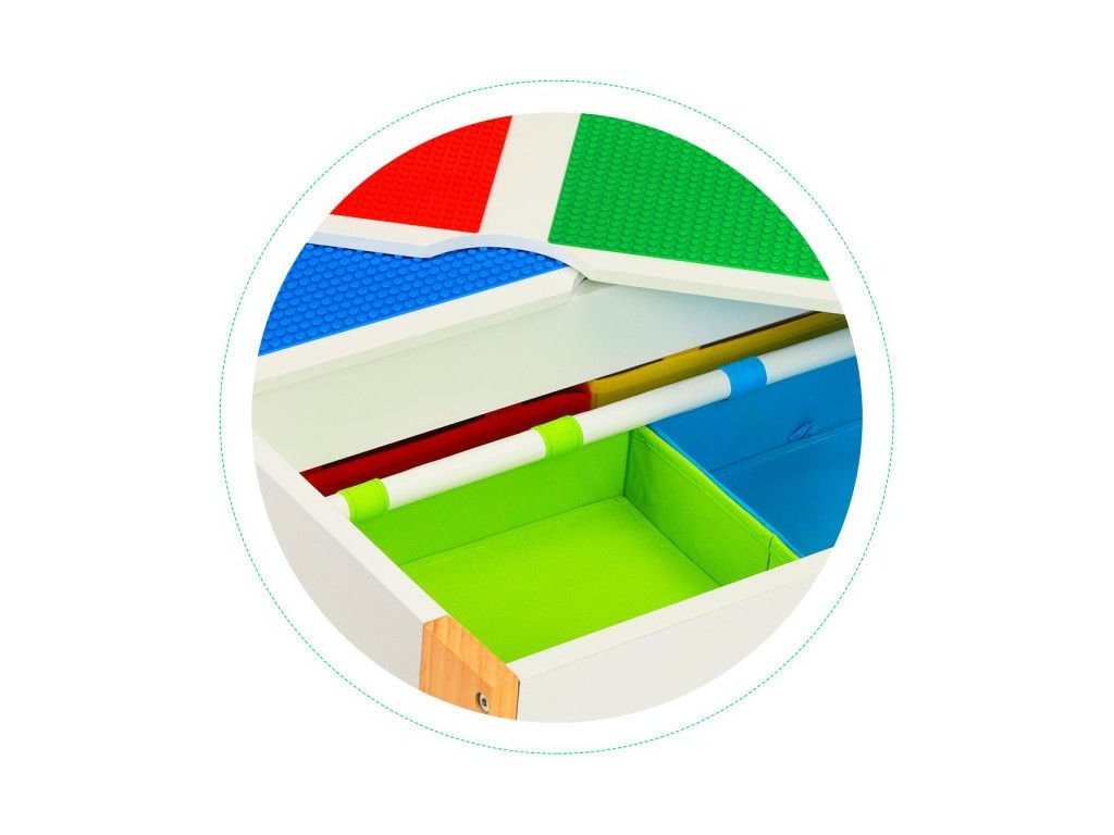 Stolík bude fungovať ako miesto, na ktorombudú vznikať výtvarné práce malých umelcov, veže z kociek a mnoho ďalších kreatívnych vecí. Po skončení zábavy je možné všetky doplnky schovať pod dosku, vďaka čomu budú vždy po ruke, pripravené na použitie. K dispozícii sú 4 priestranné priehradky, do ktorých sa zmestia kocky, hračky, kresliace potreby a dokonca aj knihy.