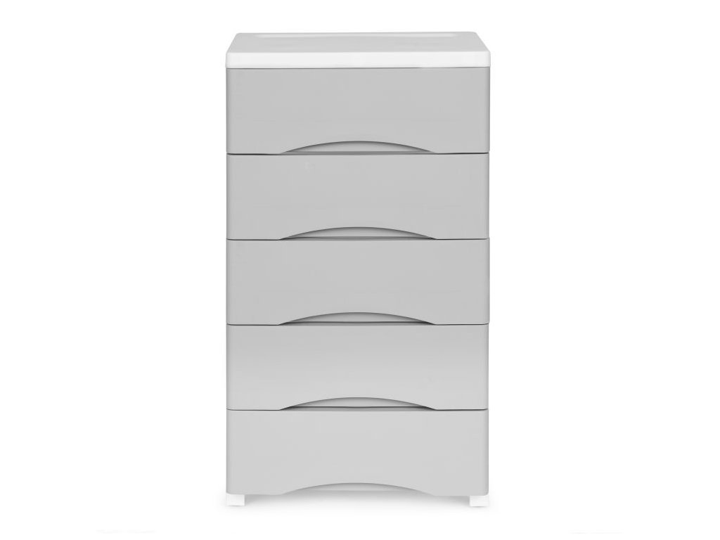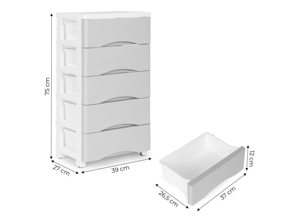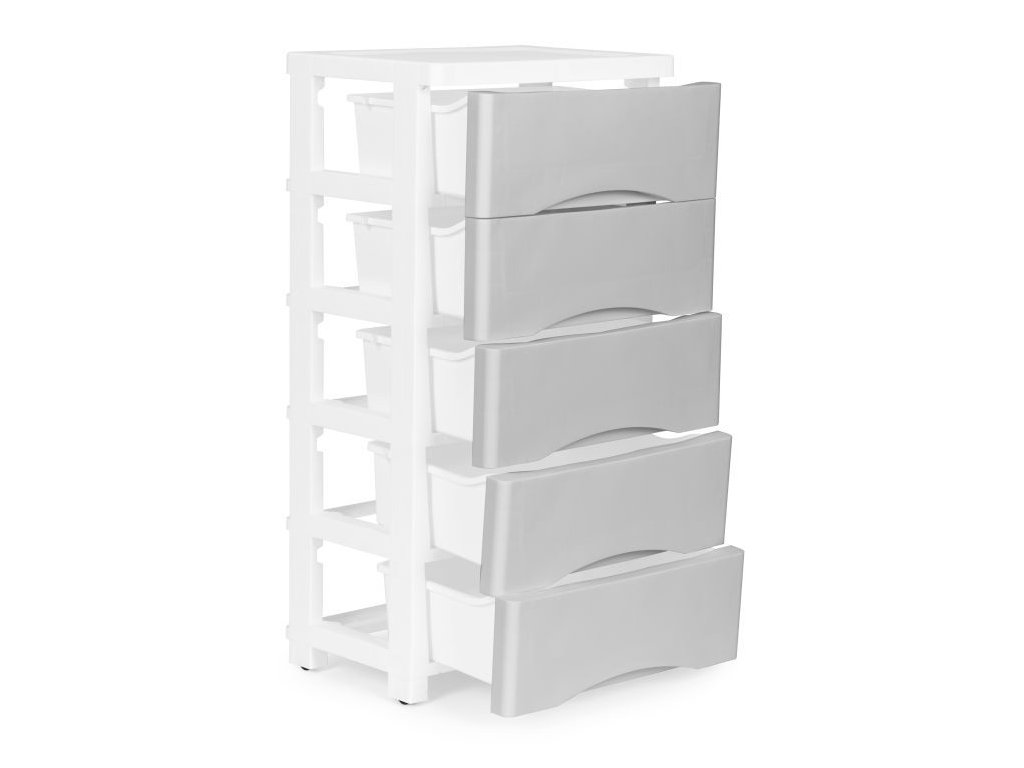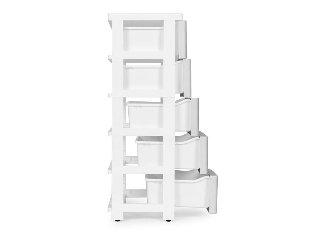 Regál sa skladá z piatich farebných zásuviek so špeciálne profilovaným držiakom na prednej strane, čo vám uľahčí ich zasúvanie a vysúvanie.