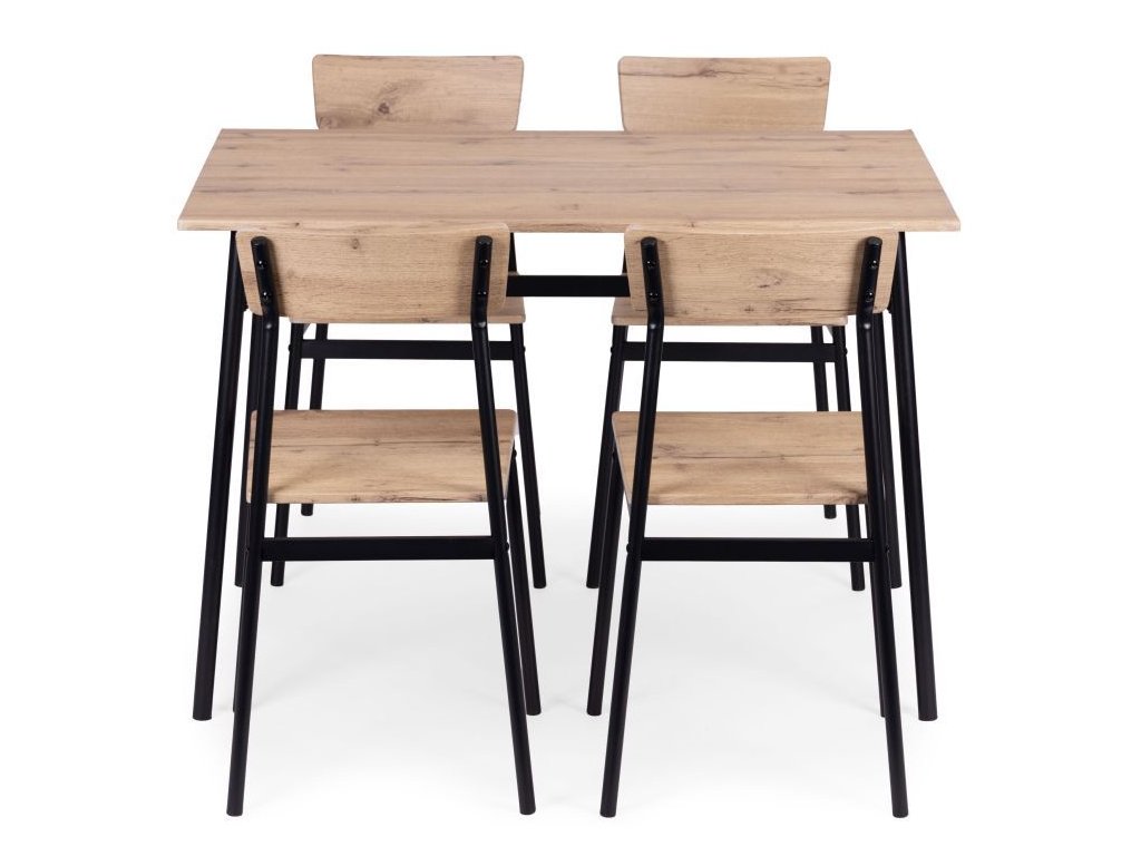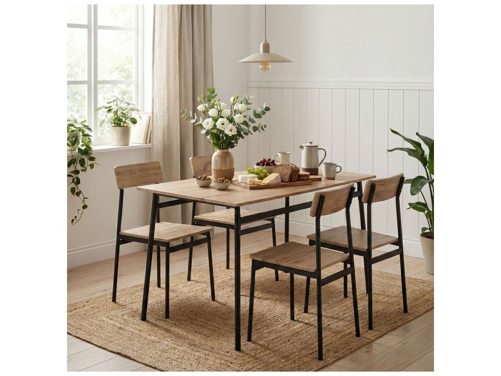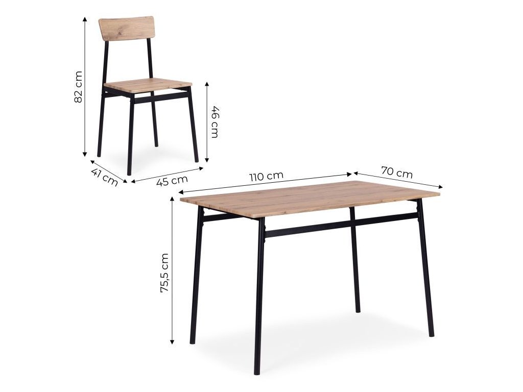 Súprava nábytku sa dokonale hodí do rôznych interiérov – od útulnej kuchyne, cez elegantnú jedáleň až po štýlovú obývačku s prístavbou. Vďaka univerzálnemu dizajnu v štýle loft harmonicky ladí s modernými, industriálnymi a minimalistickými interiérmi. Kompaktné rozmery stola a stoličiek z neho robia ideálny výber aj do menších bytov a apartmánov, kde je dôležitá funkčnosť a estetika.