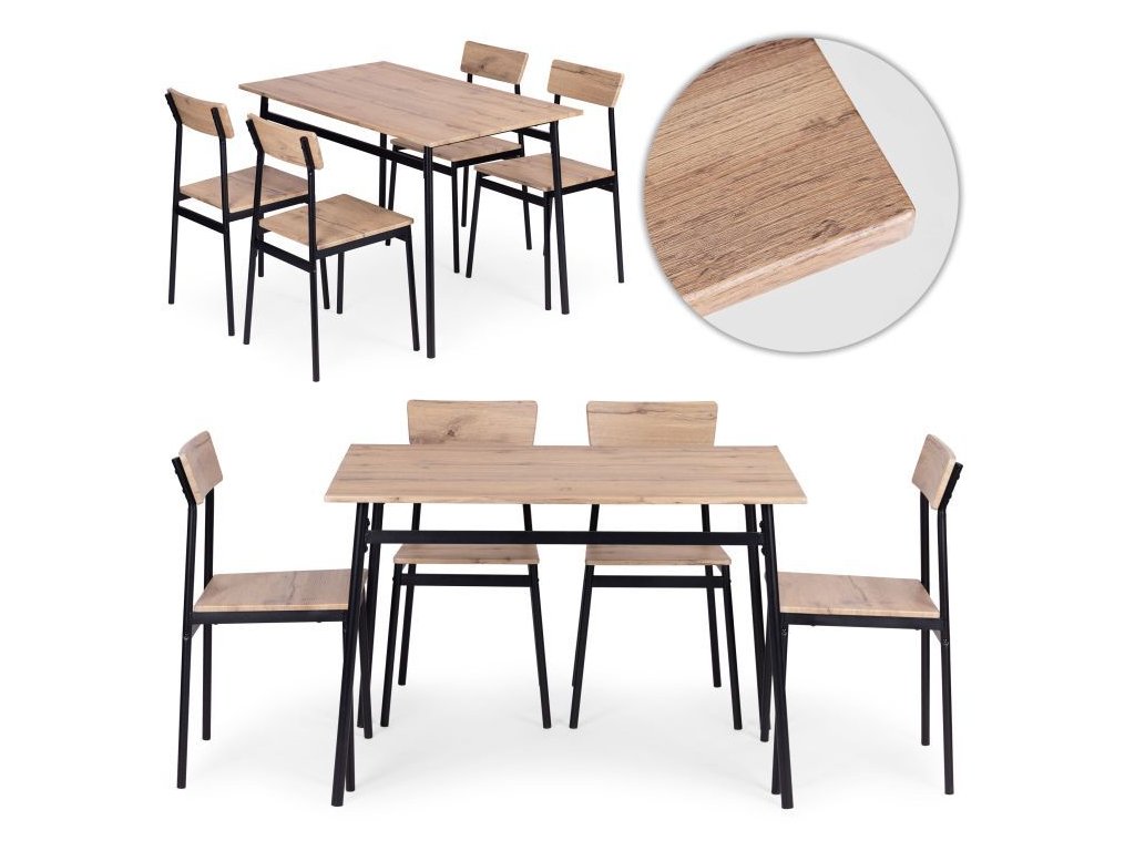 - Doska stola a prvky stoličiek sú vyrobené z MDF potiahnutého dyhou, čo zaručuje ľahké čistenie a odolnosť voči každodennému používaniu. Je to riešenie, ktoré zaručuje estetiku a trvanlivosť v jednom.