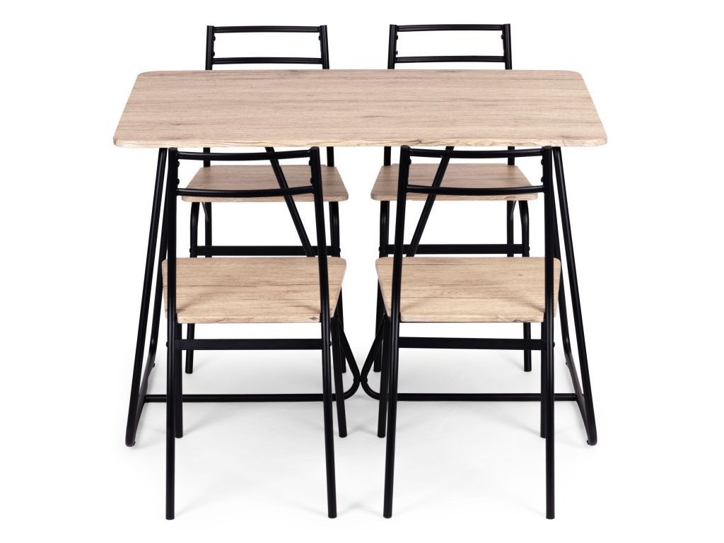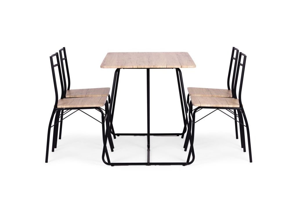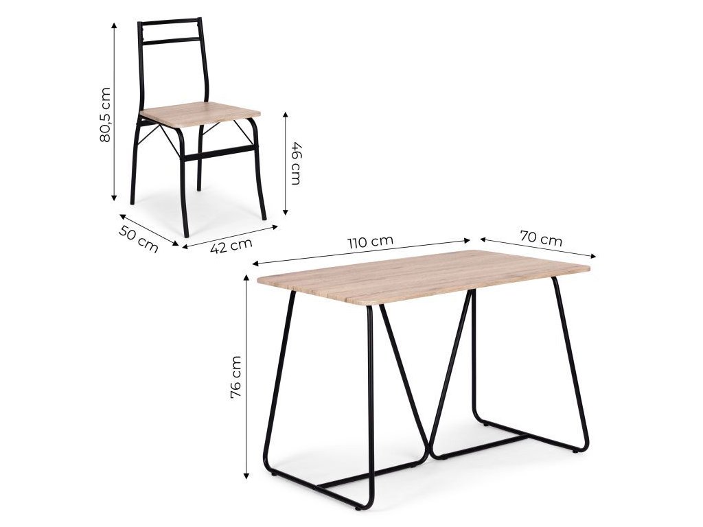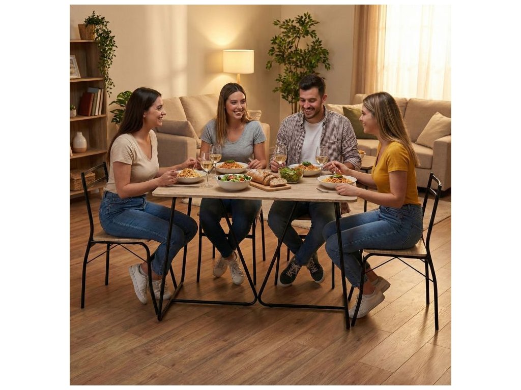 Súprava nábytku sa dokonale hodí do rôznych interiérov – od útulnej kuchyne, cez elegantnú jedáleň až po štýlovú obývačku s prístavbou. Vďaka univerzálnemu dizajnu v štýle loft harmonicky ladí s modernými, industriálnymi a minimalistickými interiérmi. Kompaktné rozmery stola a stoličiek z neho robia ideálny výber aj do menších bytov a apartmánov, kde je dôležitá funkčnosť a estetika.