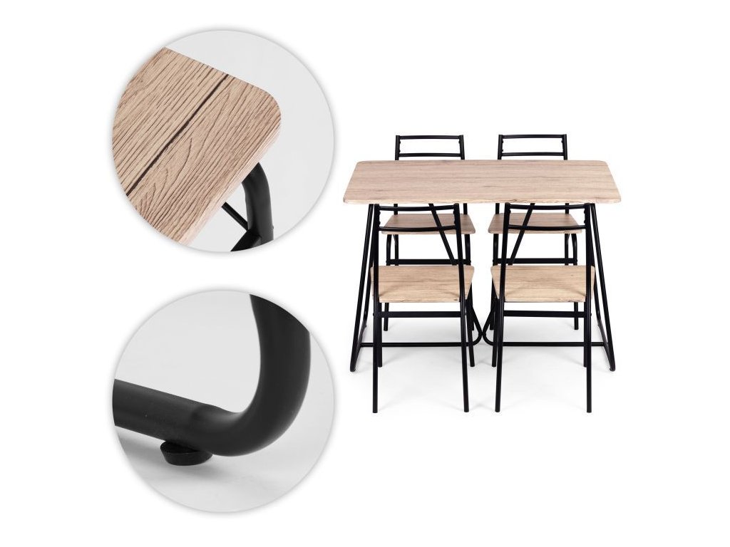 - Doska stola a prvky stoličiek sú vyrobené z MDF potiahnutého dyhou, čo zaručuje ľahké čistenie a odolnosť voči každodennému používaniu. Je to riešenie, ktoré zaručuje estetiku a trvanlivosť v jednom.