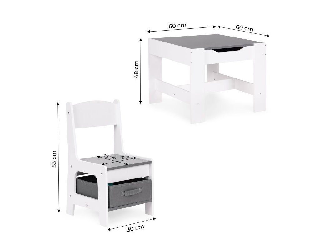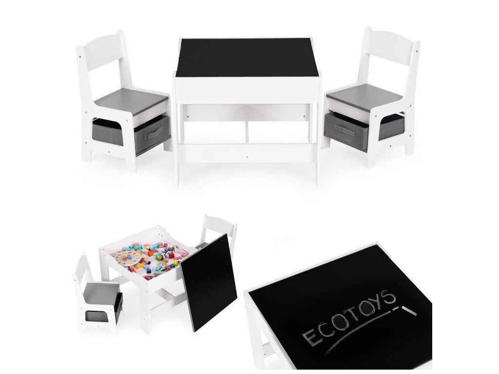 Sada detského nábytku značky ECOTOYS je ideálnym riešením pre rodičov, ktorí hľadajú praktické, bezpečné a estetické vybavenie izby svojho dieťaťa. Súprava pozostáva z stola s obojstrannou doskou a dvoch stoličiek, ktoré sú vybavené textilnou zásuvkou pod sedadlom. Vďaka tomu môžu aj najmenšie deti ľahko udržať poriadok vo svojom okolí a učiť sa organizovať už od útleho veku.