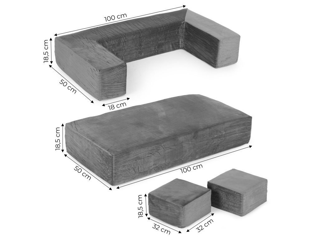 Modulárna konštrukcia pohovky umožňuje jednoduchú premenu na rôzne usporiadanie – od klasickej pohovky až po pohodlné miesto na ležanie alebo uzavretý kútik na hranie. Takéto riešenie dáva deťom možnosť aktívnej zábavy, odpočinku a relaxu v jednom. Pohovka podporuje rozvoj predstavivosti a samostatnosti, čo umožňuje malým deťom vytvoriť si vlastný priestor prispôsobený aktuálnym potrebám.