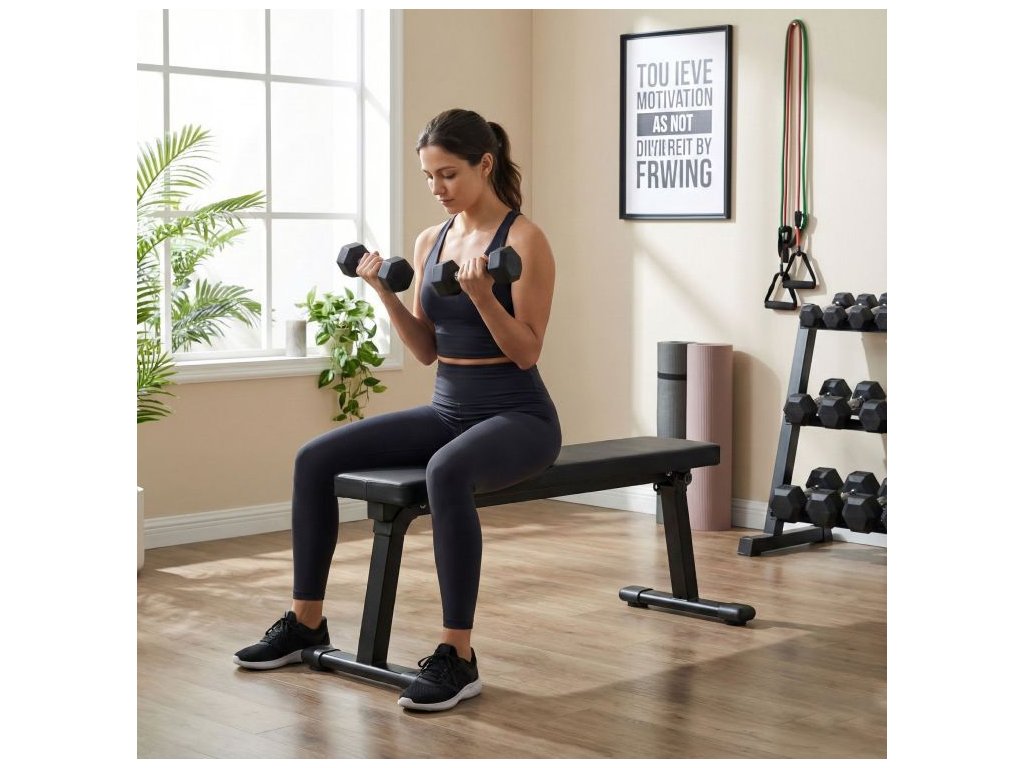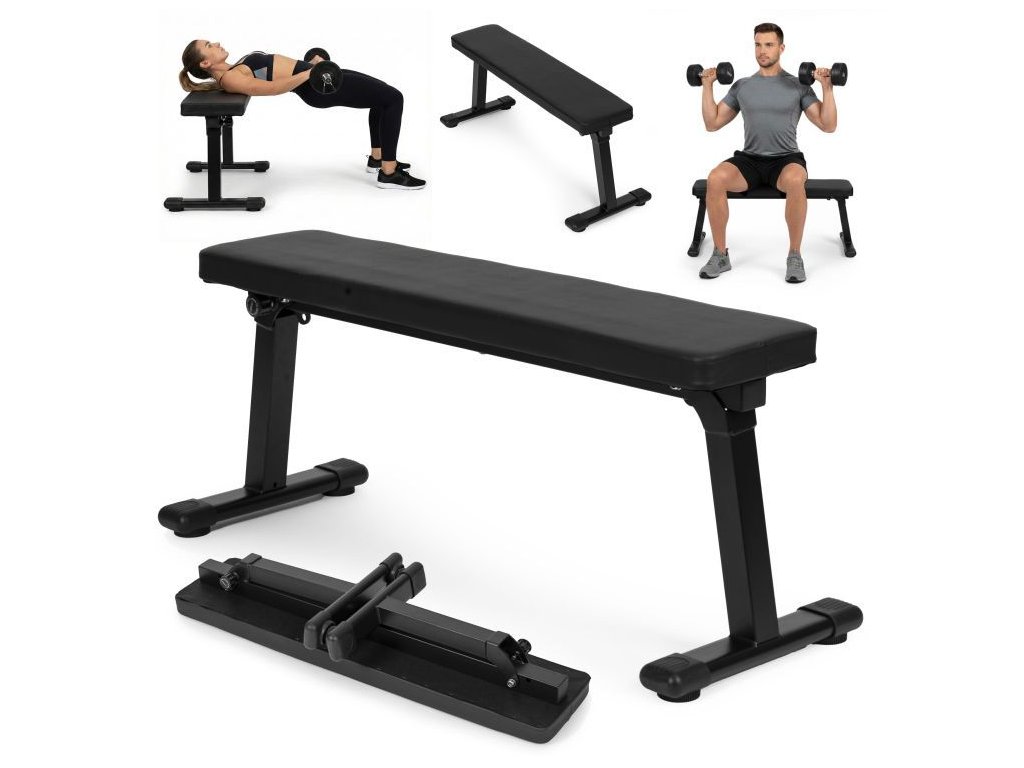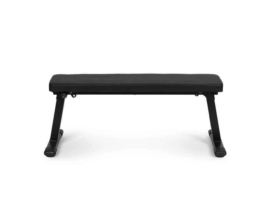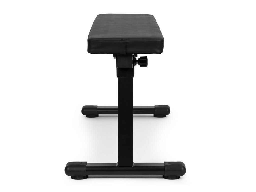 Tréningová lavička je vybavená blokovacím mechanizmom s otočným gombíkom, ktorý umožňuje rýchle a bezpečné skladanie. Stačí ho mierne odskrutkovať, potiahnuť a zablokovať – celý proces trvá chvíľu a nevyžaduje žiadne nástroje. Kompaktná forma po zložení umožňuje jednoduché uloženie lavičky pod posteľou, v skrini alebo v rohu miestnosti.