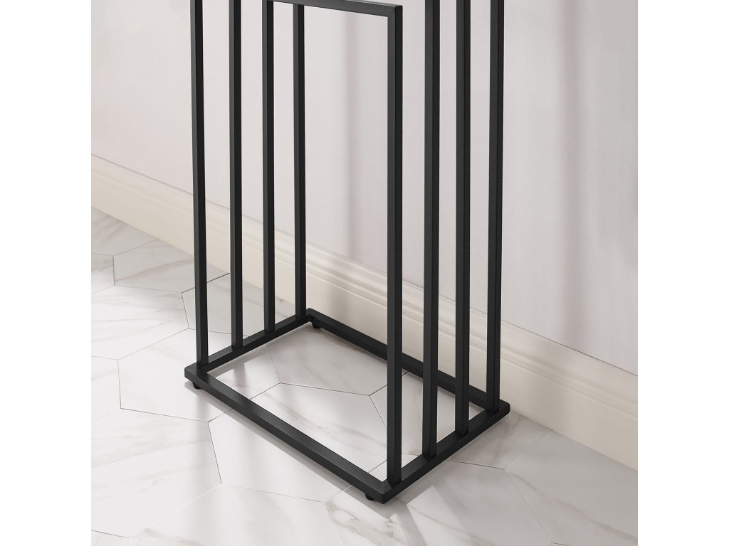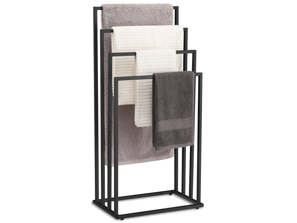 Moderný a elegantný stojan na uteráky v čiernom prevedení je praktickým doplnkom do každej kúpeľne. Vyrobený je z kvalitnej ocele s povrchovou úpravou v chróme, ktorá zabezpečuje vysokú odolnosť proti vlhkosti, korózii a každodennému používaniu.