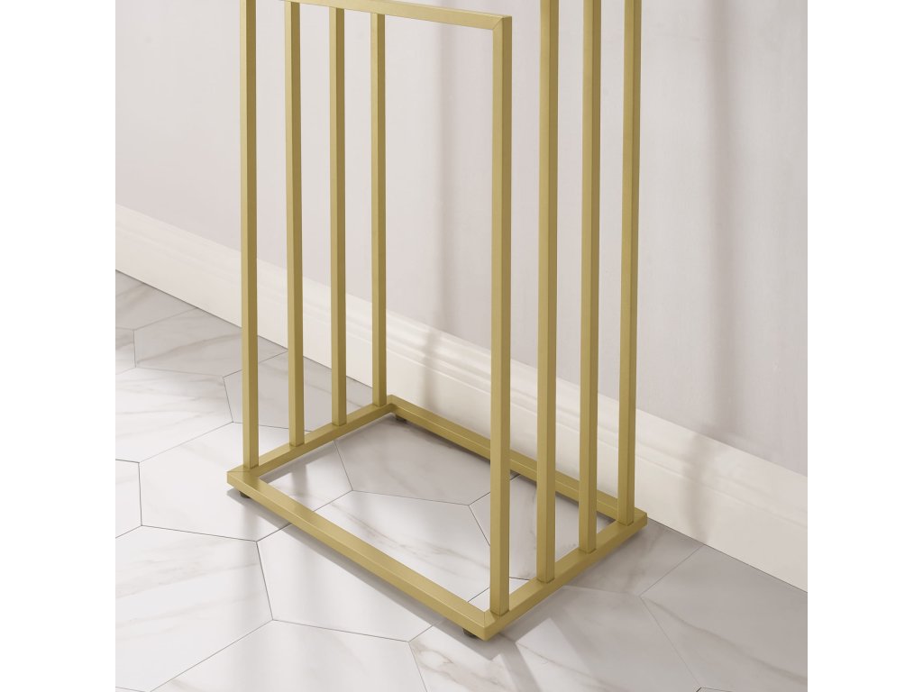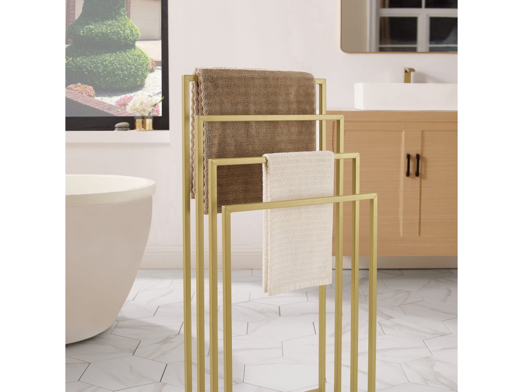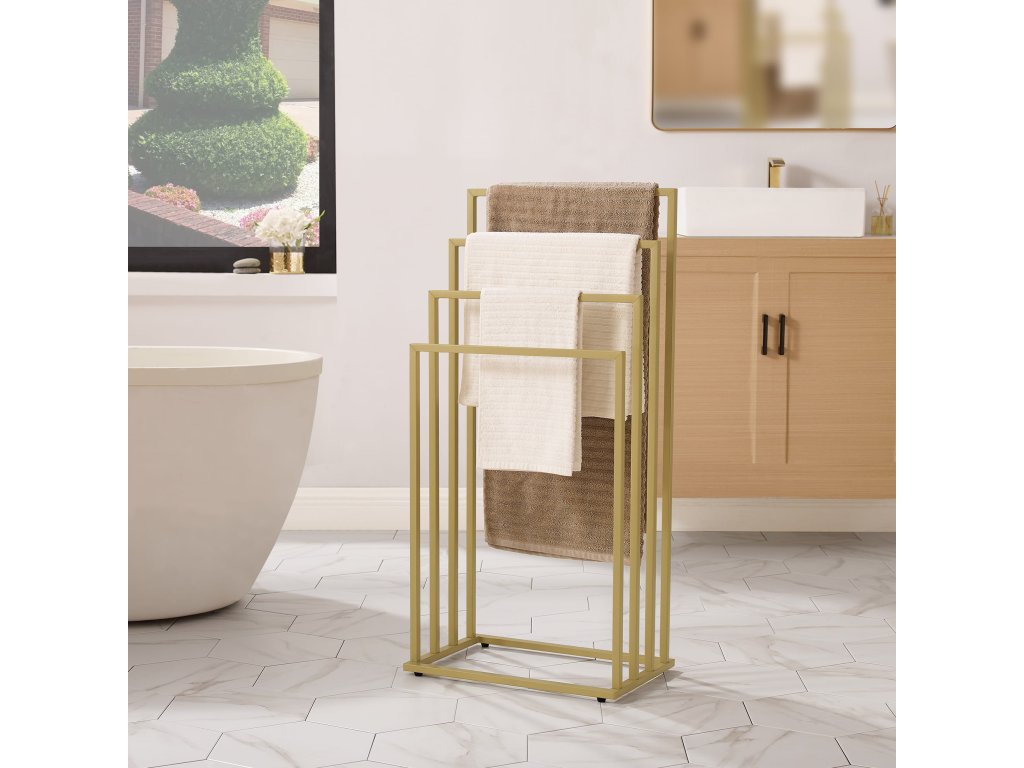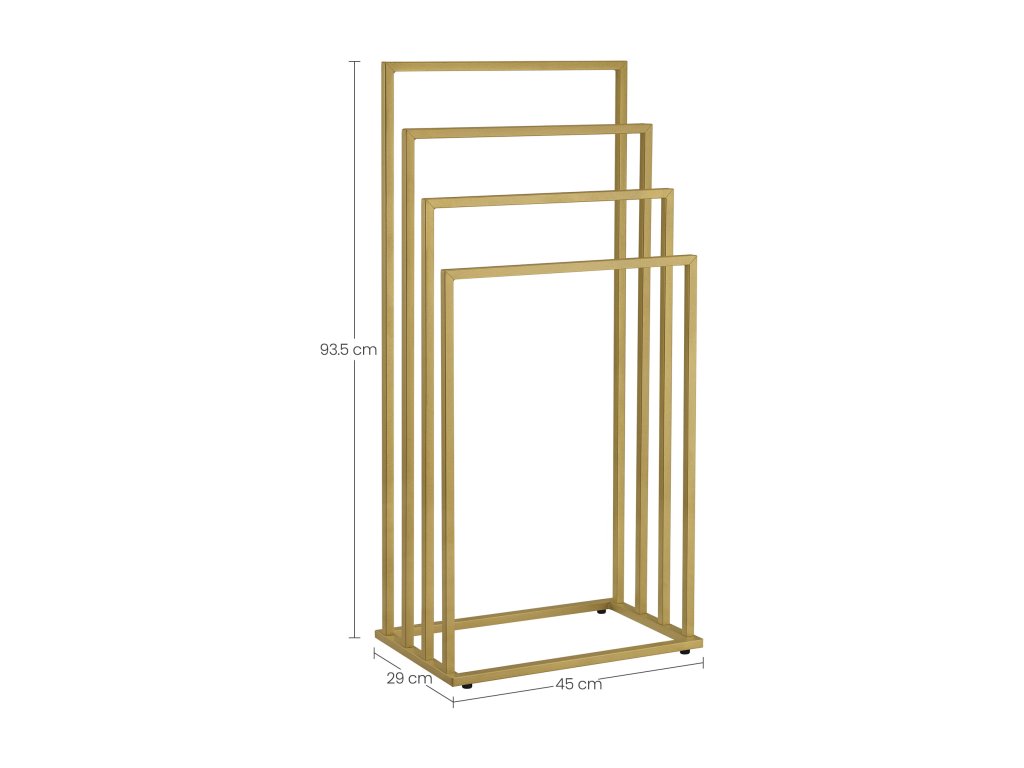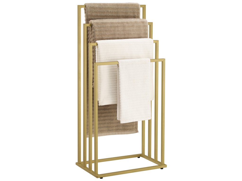 Moderný a elegantný stojan na uteráky v zlatom prevedení je praktickým doplnkom do každej kúpeľne. Vyrobený je z kvalitnej ocele s povrchovou úpravou v chróme, ktorá zabezpečuje vysokú odolnosť proti vlhkosti, korózii a každodennému používaniu.