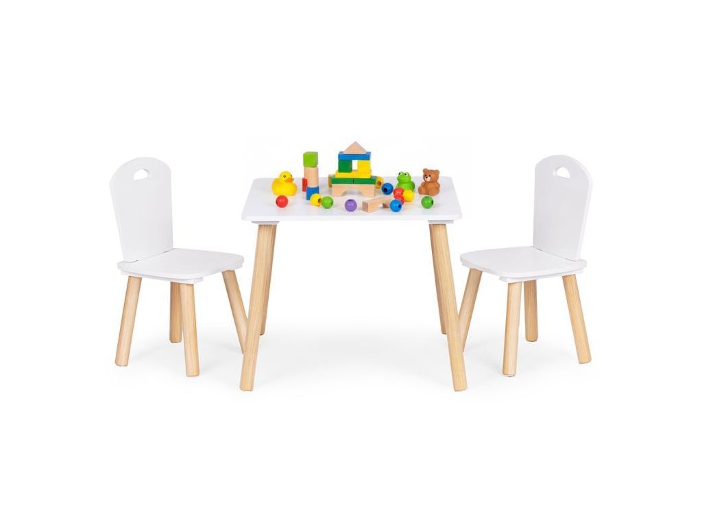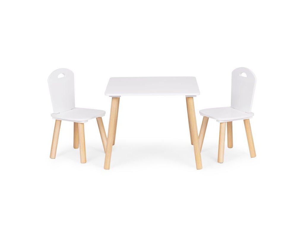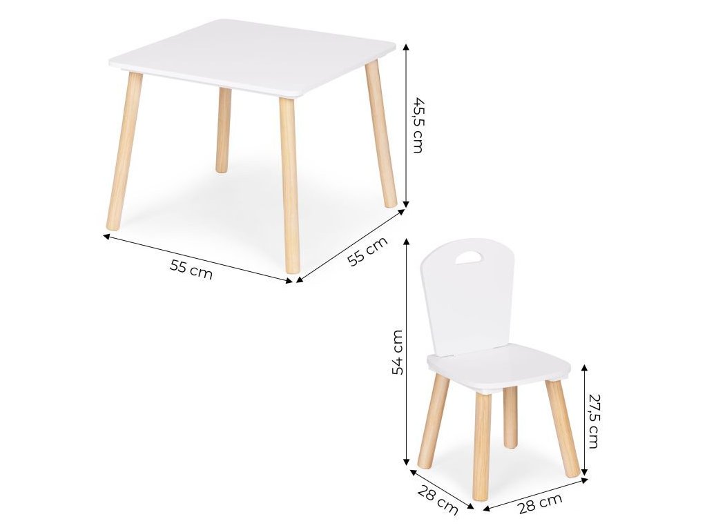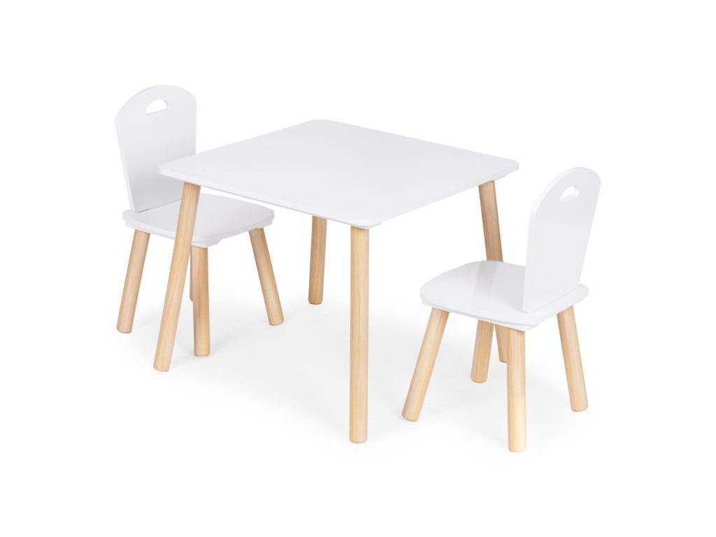 Súprava obsahuje dve pohodlné stoličky, ktorých nohy sú vyrobené z borovicového dreva a sedadlo z MDF. Rozmery stoličiek sú vhodne prispôsobené stolu, aby sa zaručilo maximálne pohodlie a voľnosť pohybu.