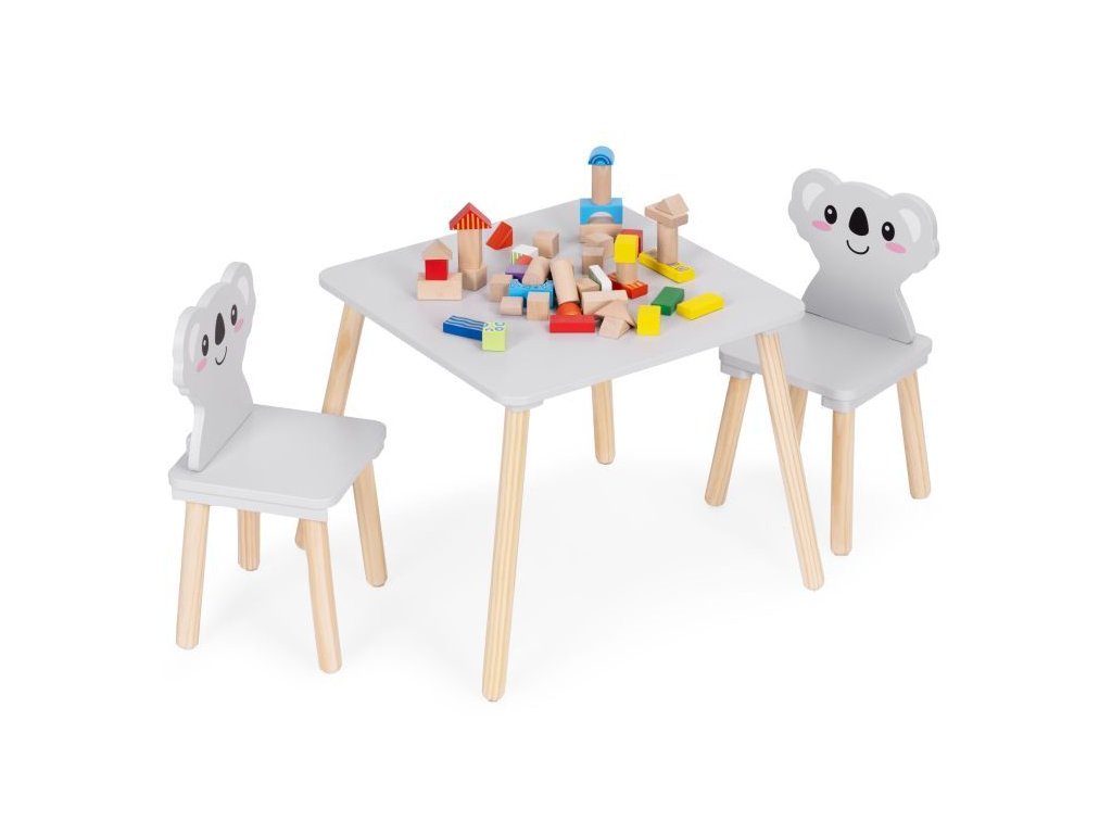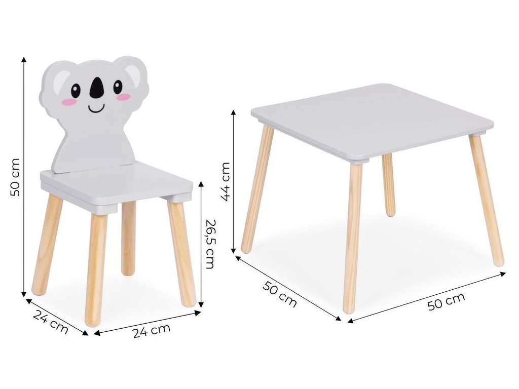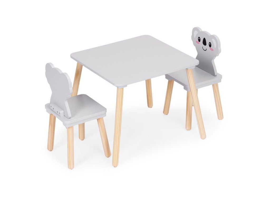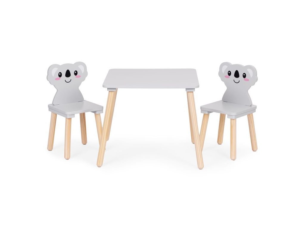 Súprava obsahuje dve pohodlné stoličky, ktorých nohy sú vyrobené z borovicového dreva a sedadlo z MDF. Rozmery stoličiek sú vhodne prispôsobené stolu, aby sa zaručilo maximálne pohodlie a voľnosť pohybu.
