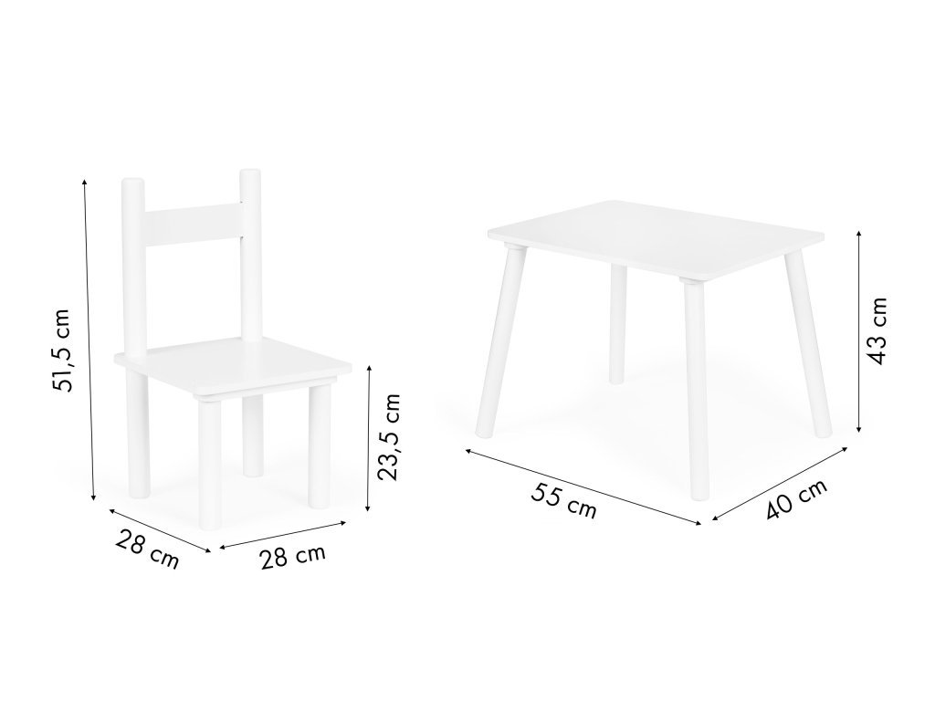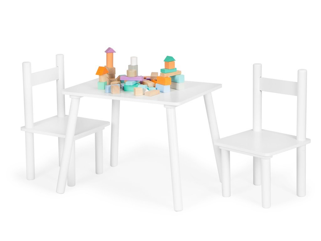 Súprava obsahuje dve pohodlné stoličky, ktorých nohy sú vyrobené z borovicového dreva a sedadlo z MDF. Rozmery stoličiek sú vhodne prispôsobené stolu, aby sa zaručilo maximálne pohodlie a voľnosť pohybu.