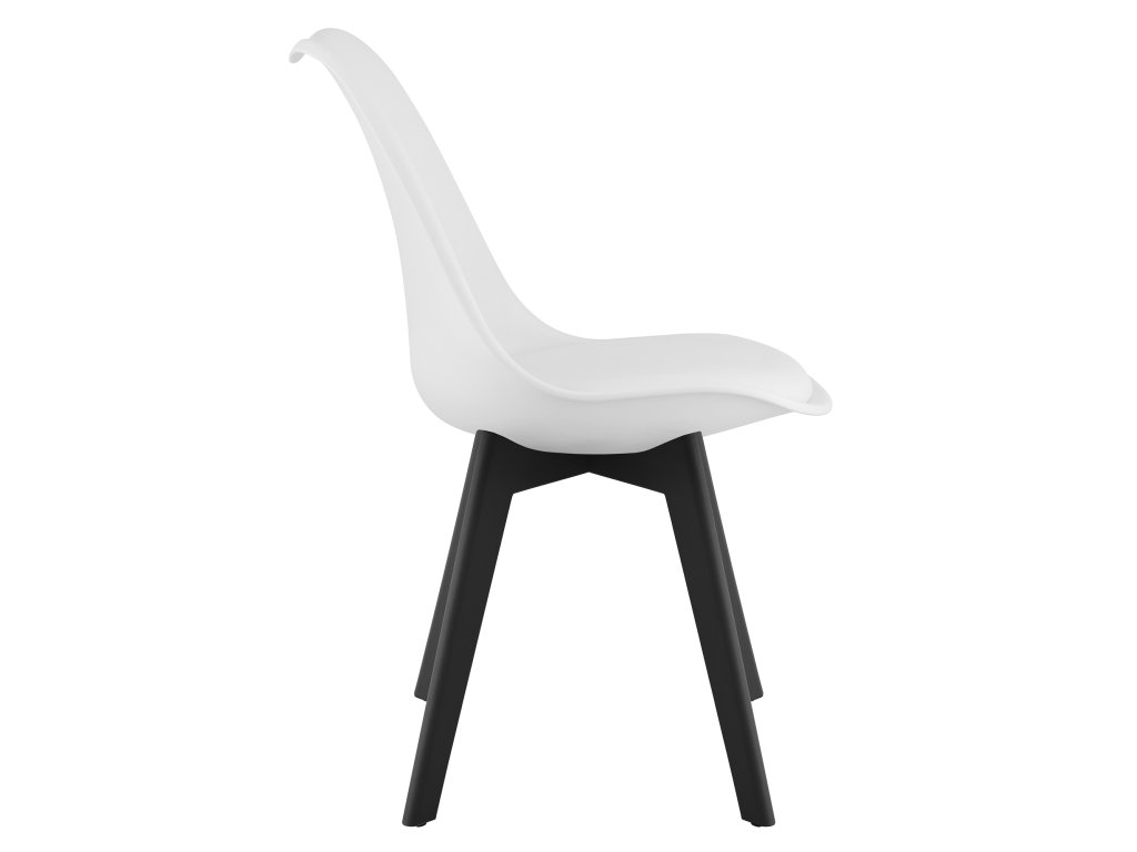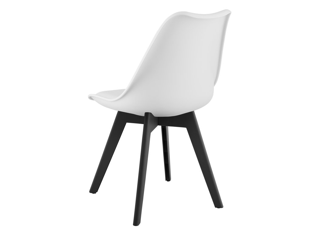 Jedálenská stolička má plastový korpus v bielej farbe a pohodlný čalúnený sedák potiahnutý koženkou