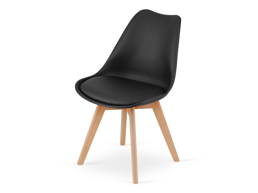 Jedálenská stolička má plastový korpus v čiernej farbe a pohodlný čalúnený sedák potiahnutý koženkou