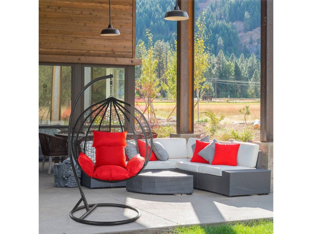Vytvorte si luxusný kútik na oddych s týmto moderným závesným hojdacím kreslom. Minimalistická čierna konštrukcia a čierny výplet vytvárajú elegantný vzhľad, ktorý perfektne zapadne do interiéru aj exteriéru. Červený vankúš s mäkkou výplňou poskytuje vysoký komfort pri relaxácii, čítaní alebo len tak pri hojdacom pohybe.