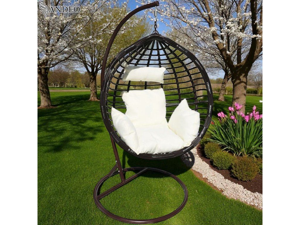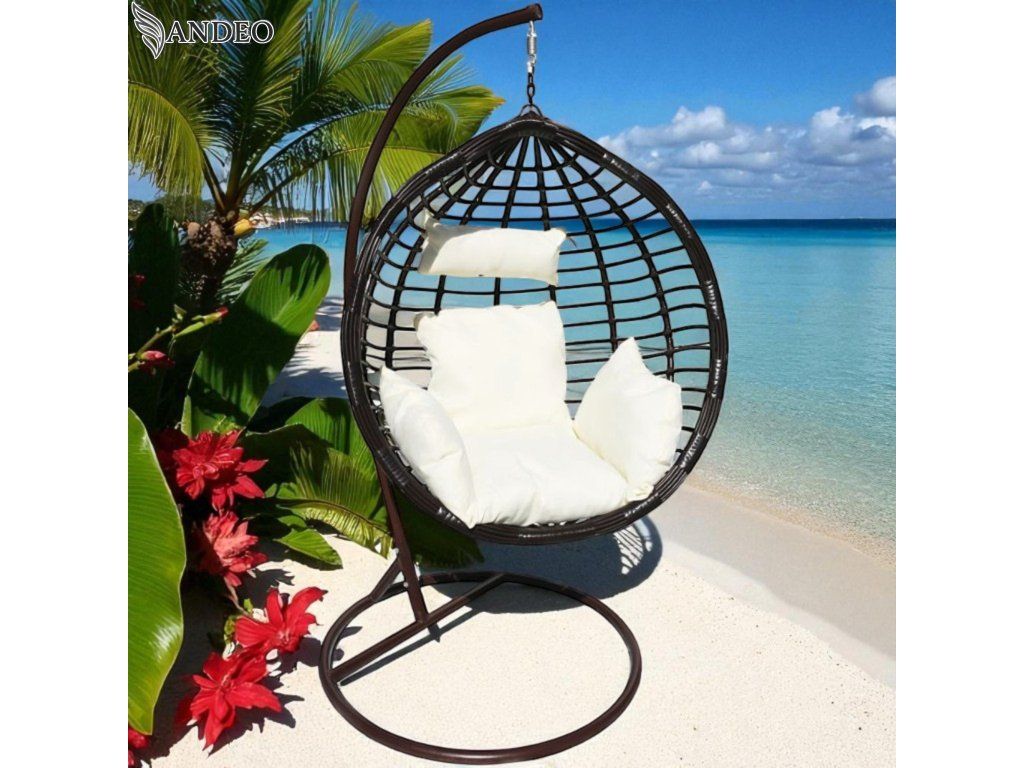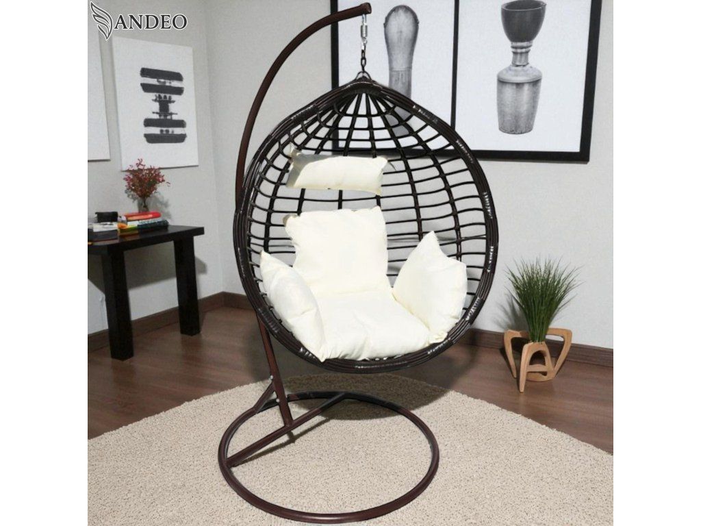 Vytvorte si luxusný kútik na oddych s týmto moderným závesným hojdacím kreslom. Minimalistická hnedá konštrukcia a hnedý výplet vytvárajú elegantný vzhľad, ktorý perfektne zapadne do interiéru aj exteriéru. Biely vankúš s mäkkou výplňou poskytuje vysoký komfort pri relaxácii, čítaní alebo len tak pri hojdacom pohybe.
