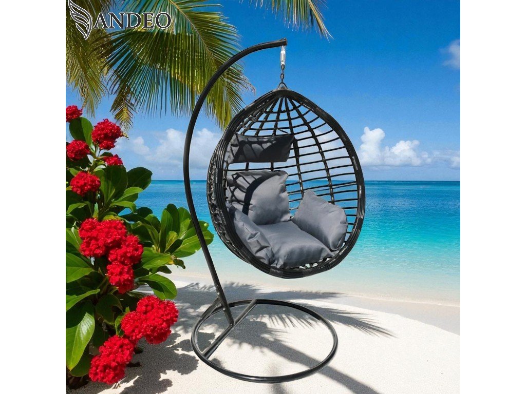 Vytvorte si luxusný kútik na oddych s týmto moderným závesným hojdacím kreslom. Minimalistická čierna konštrukcia a čierny výplet vytvárajú elegantný vzhľad, ktorý perfektne zapadne do interiéru aj exteriéru. Sivý vankúš s mäkkou výplňou poskytuje vysoký komfort pri relaxácii, čítaní alebo len tak pri hojdacom pohybe.
